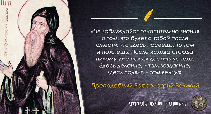 Не заблуждайся относительно знания о том, что будет с тобой после смерти: что здесь посеешь, то там и пожнешь. После исхода отсюда никому уже нельзя достичь успеха. Здесь делание, – там воздаяние, здесь подвиг, – там венцы.